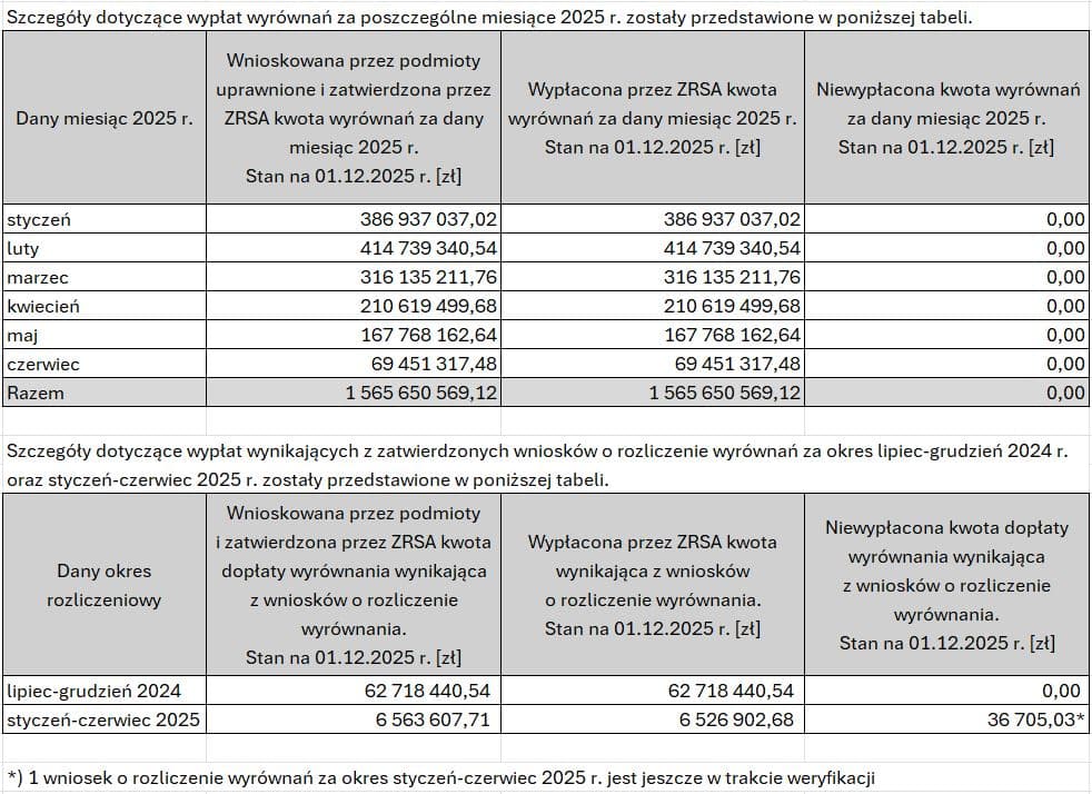 Informacja Zarządcy Rozliczeń S.A o wypłaconych kwotach wyrównań za poszczególne miesiące 2025 r. oraz wypłaconych kwotach dopłat wyrównań wynikających z wniosków o rozliczenie wyrównań za okres lipiec-grudzień 2024 r. i styczeń-czerwiec 2025 r. (aktualizacja z dnia 01.12.2025)